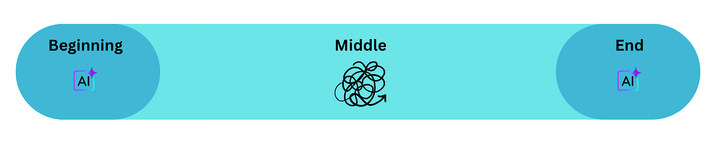 When it comes to using AI for anything creative, I like to think about the entire process of creation, from the beginning to the middle and the end. You can also apply this same framework to any project that you’re working on. I believe AI can be most useful at either end, but not for the entire thing.